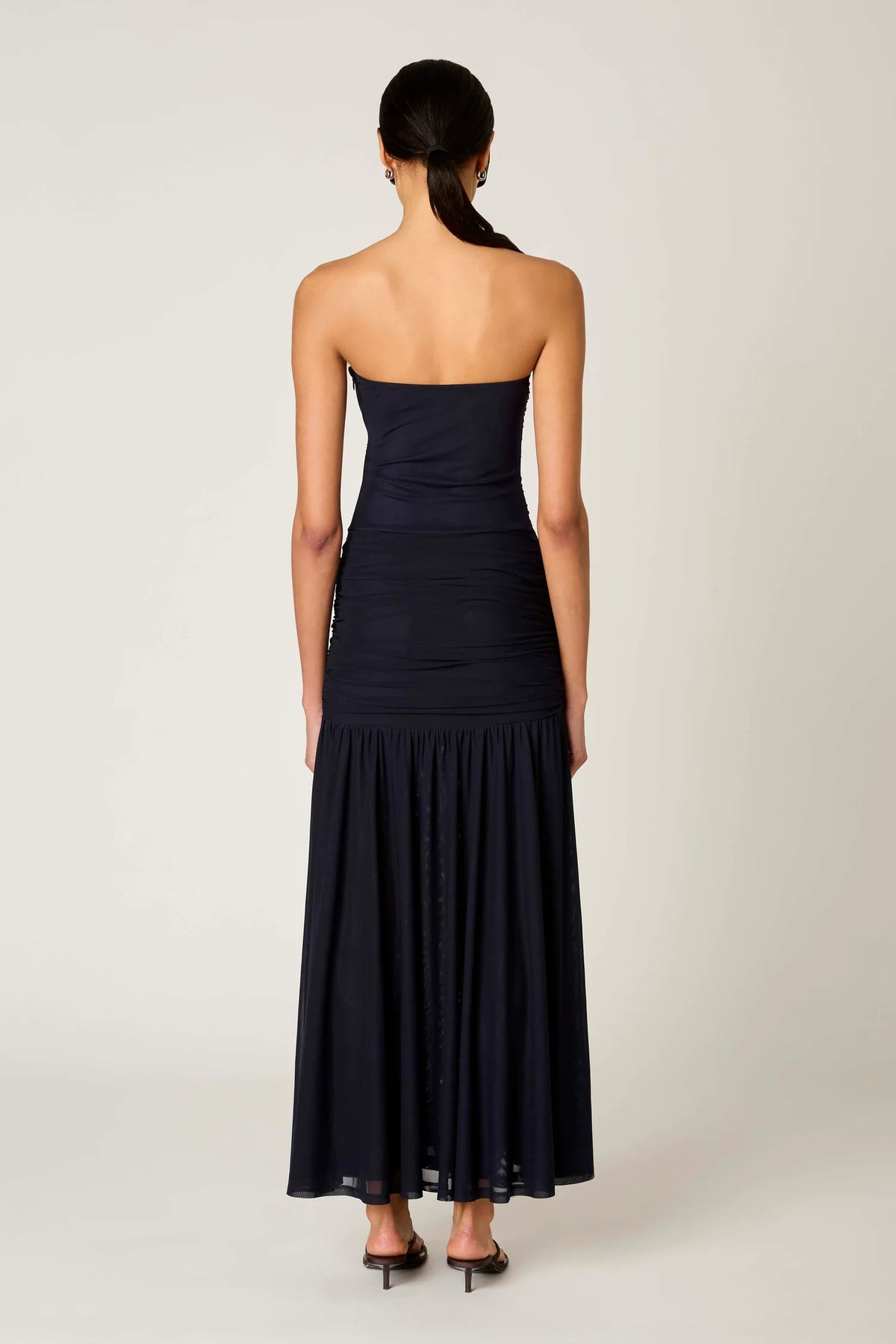 Strapless bodice with fully ruched detailing for a sculpted, figure-hugging fit