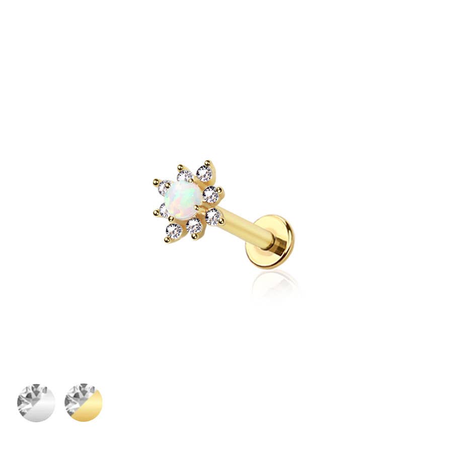 OPAL STARBURST COMET TOP THREADLESS (PUSH IN) 316L SURGICAL STEEL LABRET SET Product Code: LB373 Material: 316L Surgical Steel/Brass Sold By: PIECE Thickness: 18GA (1.0mm) Length: 5/16" (8MM)