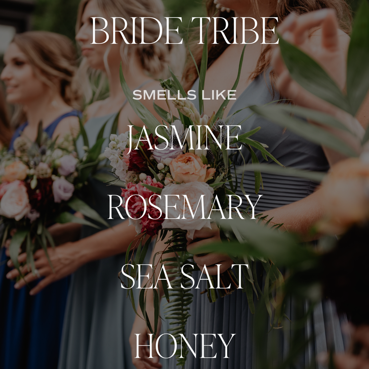 SCENT NOTES: • Top: Lemon, Rosemary, Leafy Green • Middle: Jasmine, Lily, Honey, Violet • Base: Sea Salt, Amber, Musk Our Bride Tribe candle is the perfect bachelorette or bridal party gift. A blush label with script design will make your bride tribe feel appreciated!